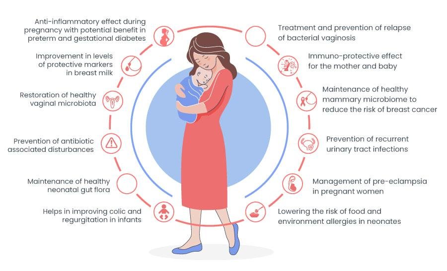Peri-natal nutritional environment positively impacts the health and well-being of mother as well as newborn child in the long term. Furthermore, breast milk contains optimal nutrients for the growth of an infant and also provides several bioactive compounds and viable beneficial microorganisms such as lactobacilli and bifidobacteria.